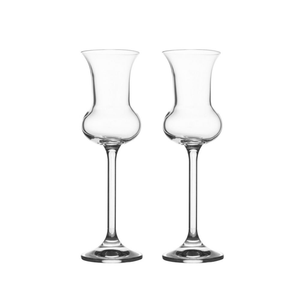 Sada dvoch elegantných pohárov na grappu alebo iný aperitív s objemom 85 ml by nemala chýbať v žiadnej domácnosti. Pohár pripomína roztvorený tulipán. Tento tvar pomáha kumulovať aromatické látky nápoja. Obsah každého pohára si tak náležite vychutnáte a každé pitie z nich