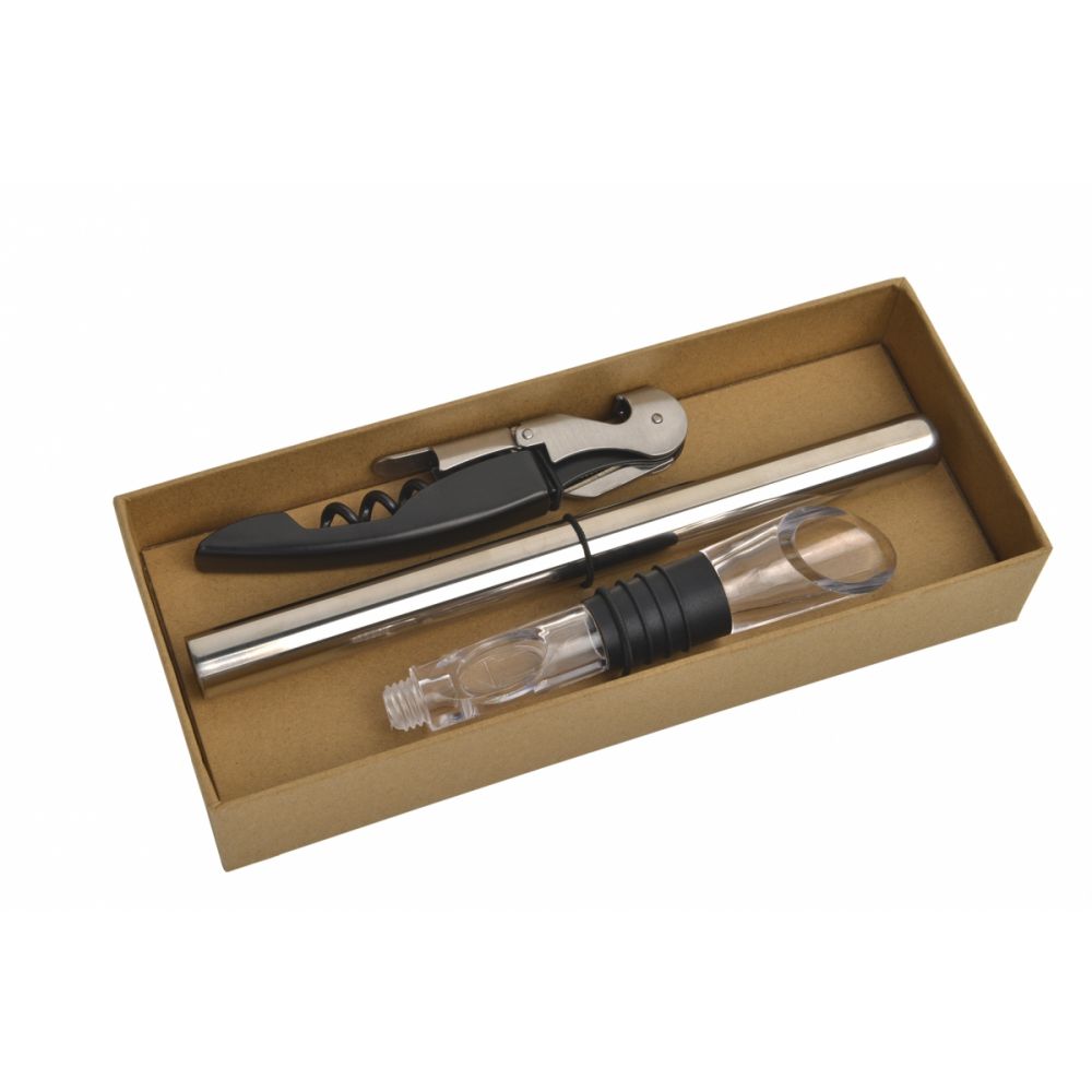 Počas romantických chvíľ pri víne určite oceníte túto sadu na víno. Sada obsahuje dvojpákovú vývrtku a chladiacu tyčinku do vína s lievikom, ktorý zaistí udržanie teploty vašej fľaše vína po celú dobu pitia. Chladič stačí dať na 30 minút do mrazničky, potom na neho priskrutkovať lievik a vložiť